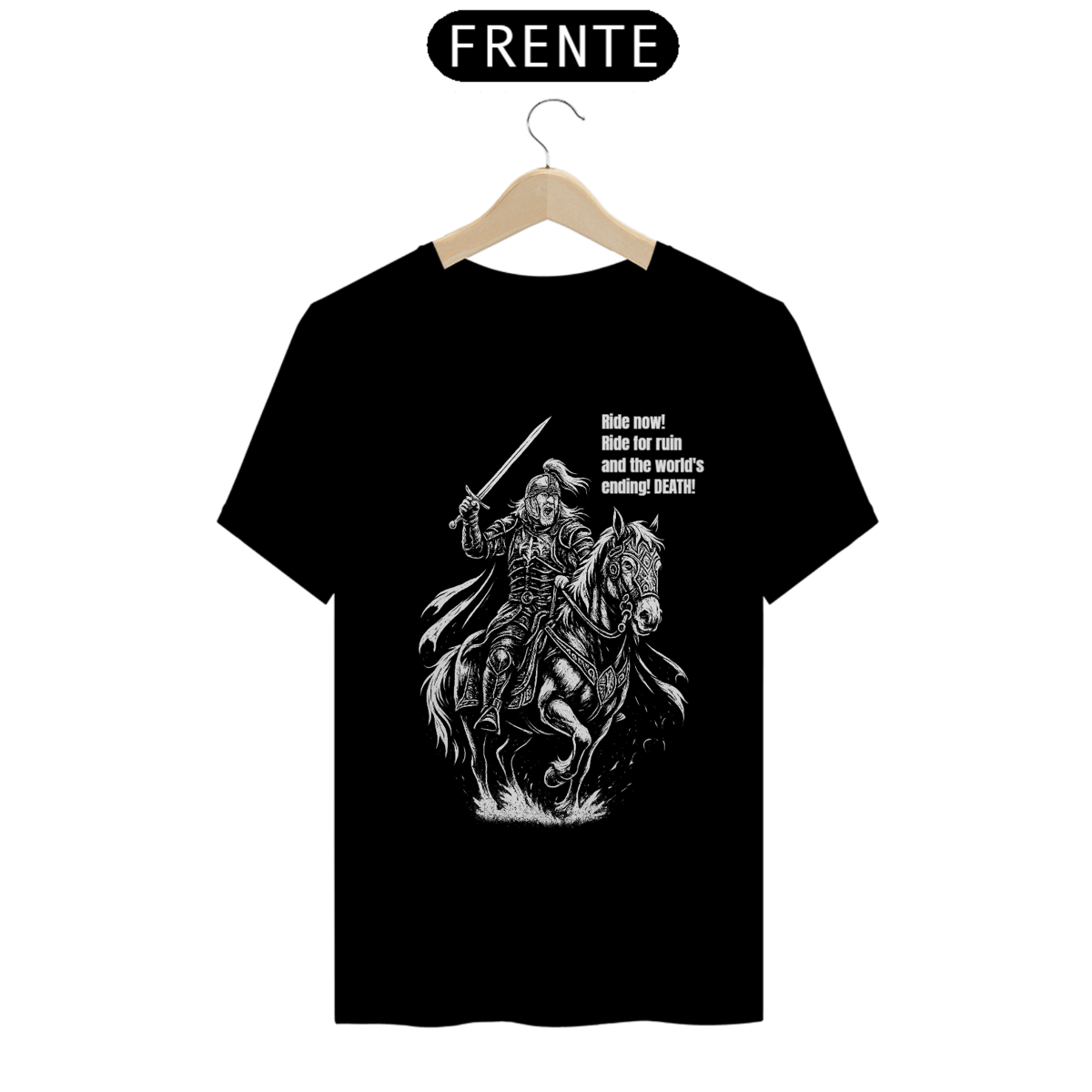 Quando o medo se espalha e a esperança vacila, surge um grito que atravessa os séculos. Esta camiseta carrega a fúria e a bravura dos que cavalgam rumo à última luz — um chamado à coragem diante da escuridão.