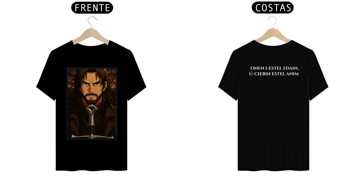 Nesta estampa exclusiva da Loja Nerd Sideral, Aragorn é retratado em traço anime, com o olhar firme de quem carrega o destino de povos inteiros — e a dor silenciosa de uma linhagem marcada pela responsabilidade.